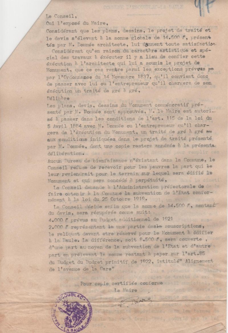 Ce n'est qu'en septembre 1921 que le marché est enfin conclu (doc 7), avec un certain monsieur Dommée, architecte nazairien qui s'était déjà signalé à l'attention de la municipalité d'Escoublac-La Baule en proposant un panneau de bronze comme monument aux morts, en août 1919. Monsieur Pavie avait-il alors été favorablement impressionné par le personnage ? Quoiqu'il en soit, c'est ce même architecte qui remporte la mise deux ans après, quand la commune fait désormais de la construction de son monument aux morts une priorité. On retiendra un autre aspect étonnant, dans cette démarche décidemment atypique de la municipalité bauloise : le coût de 14 500 francs ne semble guère poser problème, alors que la mairie faisait la difficile, deux ans auparavant, pour des devis plus de deux fois moins chers.