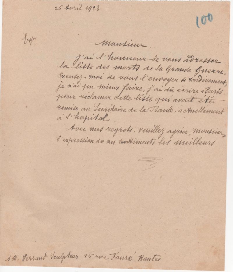 Doc 9 : Lettre du 26 avril 1923, du maire au sculpteur. Comme pour Pornichet, un examen attentif de la liste des 143 morts inscrits sur le monument montre deux ajouts à la liste initiale.