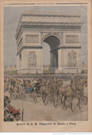 La gravure du Petit Journal montre Nicolas II et l'impératrice Alexandra dans leur voiture tirée par quatre chevaux et ornée du monogramme du tsar. En face d'eux est assis le président Félix Faure. Une double haie de fantassins levant leurs armes contient la foule en liesse. Celle-ci est simplement suggérée par quelques hommes au premier plan qui lèvent leur chapeau pour saluer les souverains russes. L'Arc de Triomphe au deuxième plan occupe toute la partie haute de l'image. Il impressionne par sa monumentalité et contribue à la solennité de la scène.