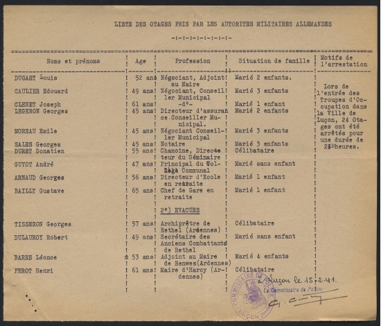 - Les mesures de " répressions " immédiates (prises d'otages, amendes...).La prise d'otage est une démarche classique pour les troupes allemandes quand elles entrent dans une ville. Les listes montrent que ce sont souvent des notables qui sont concernés et que les " choses se terminent bien " puisque aucun acte de résistance n'a lieu.