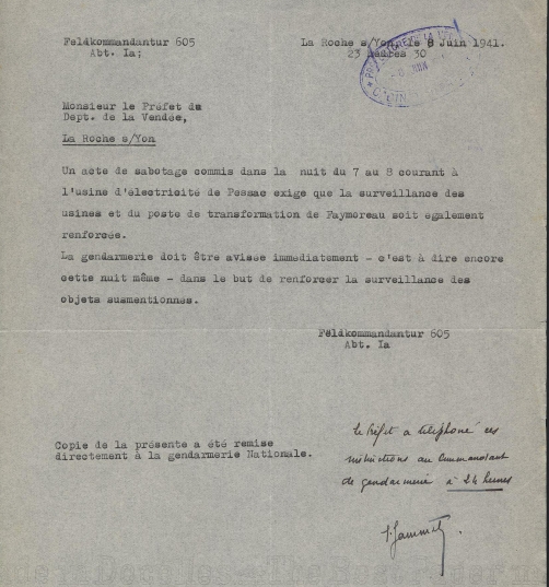 - lettre de la Feldkommandantur au préfet de Vendée par crainte de sabotage