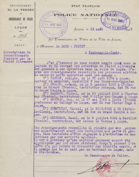 - lettre du commissaire de police de Luçon au préfet après l'arrestation de suspects par l'autorité allemande