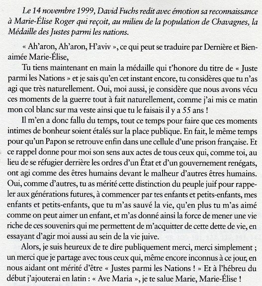 Après l'arrestation en Normandie et la déportation de ses parents en 1942, David Fuchs est d'abord recueilli par une tante, à Paris. Devant l'aggravation du danger, il est conduit à Chavagnes avec sa sœur par Suzanne Mathieu au début de 1944. D'abord placé dans une autre famille chavagnaise sous le nom de Daniel, il est rapidement transféré chez Marie-Lise Roger. Il est alors âgé de 10 ans.