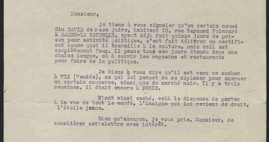 - une lettre de dénonciation (avec tous les lieux communs de l'antisémitisme) dans une autre communauté villageoise vendéenne, qui permet de mettre en valeur l'attitude des Chavagnais.