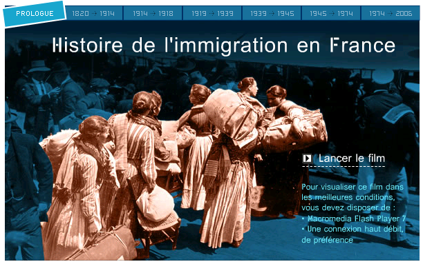 un film composé de 350 photographies et documents d’archive, ponctué d’extraits sonores, retraçant en quarante minutes deux siècles d'histoire de l’immigration en France. Le découpage en séquences permet à l'enseignant de sélectionner les périodes sur lesquelles il souhaire faire travailler ses élèves. En 3è, on peut ainsi utiliser les deux dernières séquences pour caractériser l'évolution des migrations de 1945 à nos jours.