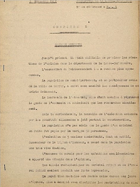 Ce rapport, confirmé par d'autres, suggère que l'opinion réagit fortement aux exécutions et que cette réaction se traduit par une hostilité croissante à l'occupant. On notera l'allusion à l'exécution d'anciens combattants qui figurent effectivement parmi les victimes fusillées à Nantes. Par contre rien n'est précisé sur l'appartenance communiste de celles de Châteaubriant. Dans un autre rapport du 2 janvier 1942, la Préfet précise cette fois que les fusillés sont communistes et que leur exécution " a profondément remué la population qui a tendance à considérer les internés (sic) comme des martyrs.
