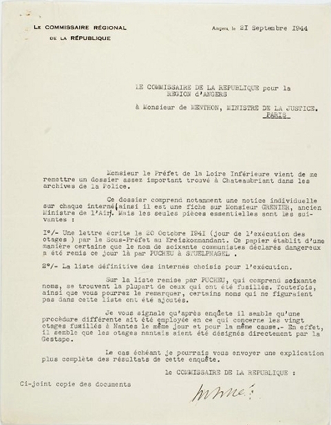Les Archives départementales de Maine-et-Loire abritent dans la série W quelques documents concernant l'exécution des otages de Châteaubriant en octobre 1941. A cette époque Angers est capitale régionale, puis devient le siège du Commissariat de la République au moment de la libération. Ainsi peut on trouver en Anjou les traces d'événements survenus dans la Loire Inférieure de l'époque. Après un rappel de ces derniers destiné à faciliter le travail des enseignants, nous vous présentons quelques uns de ces précieux documents.