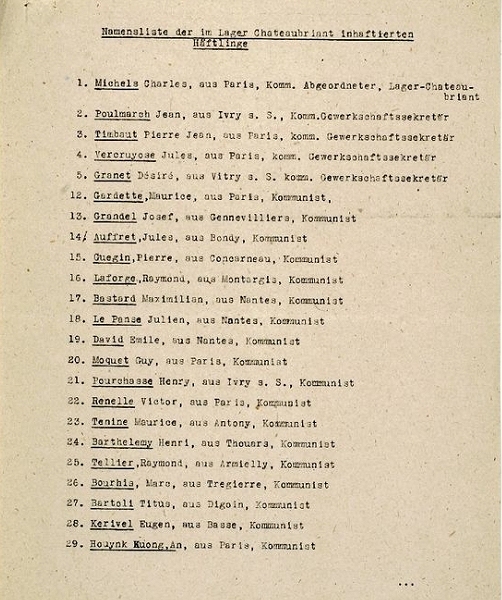 3 - Lettre du Sous-préfet de Châteaubriant au chef des troupes d'occupation de la ville. 20 octobre 1941. Transcription. Ce document est accablant pour le gouvernement de Vichy : il prouve que le jour de l'attentat il a fait parvenir une liste de 60 communistes aux nazis. Dans cette liste (non reproduite), Guy Môquet ne figure pas : il sera ajouté par les Allemands.