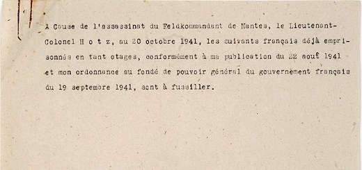 Certes, depuis 1940, les nazis détiennent des otages, le plus souvent des notables locaux (entre dix et vingt à Nantes). Mais ils les utilisent comme garant de l'ordre public. De même depuis longtemps de nombreux communistes sont en prison ou en résidence surveillée : mais c'est surtout à l'initiative du gouvernement de Vichy (23 des 27 otages ont été arrêtés avant Juin 1941). Les exécutions d'otages ont déjà débuté : 25 sont fusillés en plusieurs vagues après l'attentat du métro Barbès - Rochechouart ; mais celui de Nantes va marquer un tournant : les fusillades deviennent massives et prennent un caractère idéologique. En effet Hitler en personne et Keitel exigent 50 fusillades d'otages par victime allemande et inscrivent la répression dans le cadre de la lutte contre le " judéo-bolchevisme " qui est en train de devenir l'obsession des nazis. C'est pourquoi la quasi-totalité des fusillés de Châteaubriant sont des militants communistes, des cadres souvent mais aussi de simples et jeunes militants comme Guy Môquet qui avait été arrêté dès octobre 1940 pour distribution de tracts à Paris. Il est à noter que les responsables militaires allemands de Paris, en particulier le général Otto von Stülpnagel qui les commande sont peu favorables aux exécutions d'otages non pas tellement par générosité ou humanisme, mais par tactique, considérant que de tels actes radicalisent une opinion qui n'est déjà que trop hostile aux troupes d'occupation. Les faits semblent leur donner raison : les rapports de préfets signalent partout que la population désapprouve les attentats, mais que les exécutions la révulsent. Au total, l'effet de terreur recherché par Hitler parait néanmoins atteint car la question des otages taraude l'opinion publique qui redoute ses effets : il faut bien réaliser, qu'au-delà des " 50 otages " fusillés dans la région nantaise, ce sont 814 personnes qui tombent face aux pelotons nazis entre septembre 1941 et octobre 1943. Contraint de se soumettre aux volontés de son Führer, von Sülpnagel n'en suggère pas moins de pratiquer une autre méthode, qui finalement ne se substituera pas mais s'ajoutera aux fusillades d'otages, celles des déportations de juifs et de communistes vers l'est, qui effectivement, se multiplient bientôt. Si bien qu'au total, dans cette affaire, les premières étapes du génocide en France se trouvent liées étroitement à l'épisode nantais.
