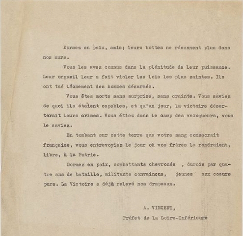 Ce discours dont le reste a été perdu a sans doute été prononcé à Nantes ou Châteaubriant lors de la première commémoration des fusillades le 22 octobre 1944.