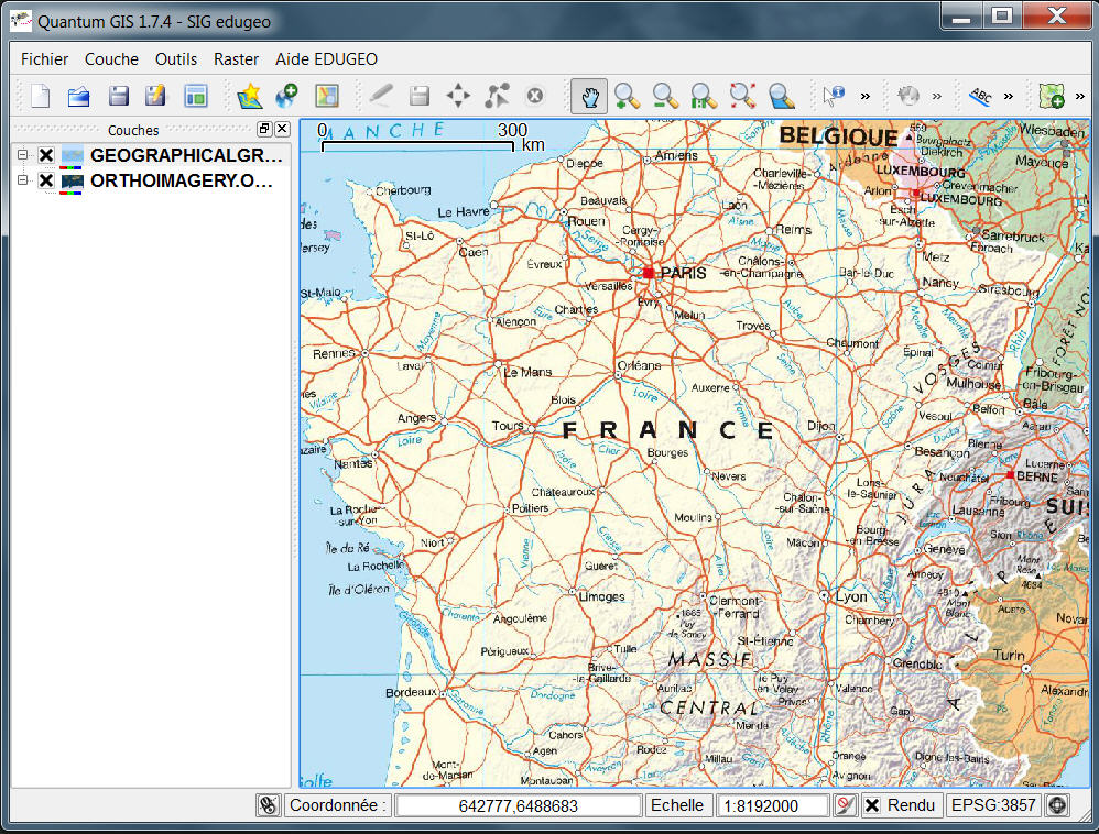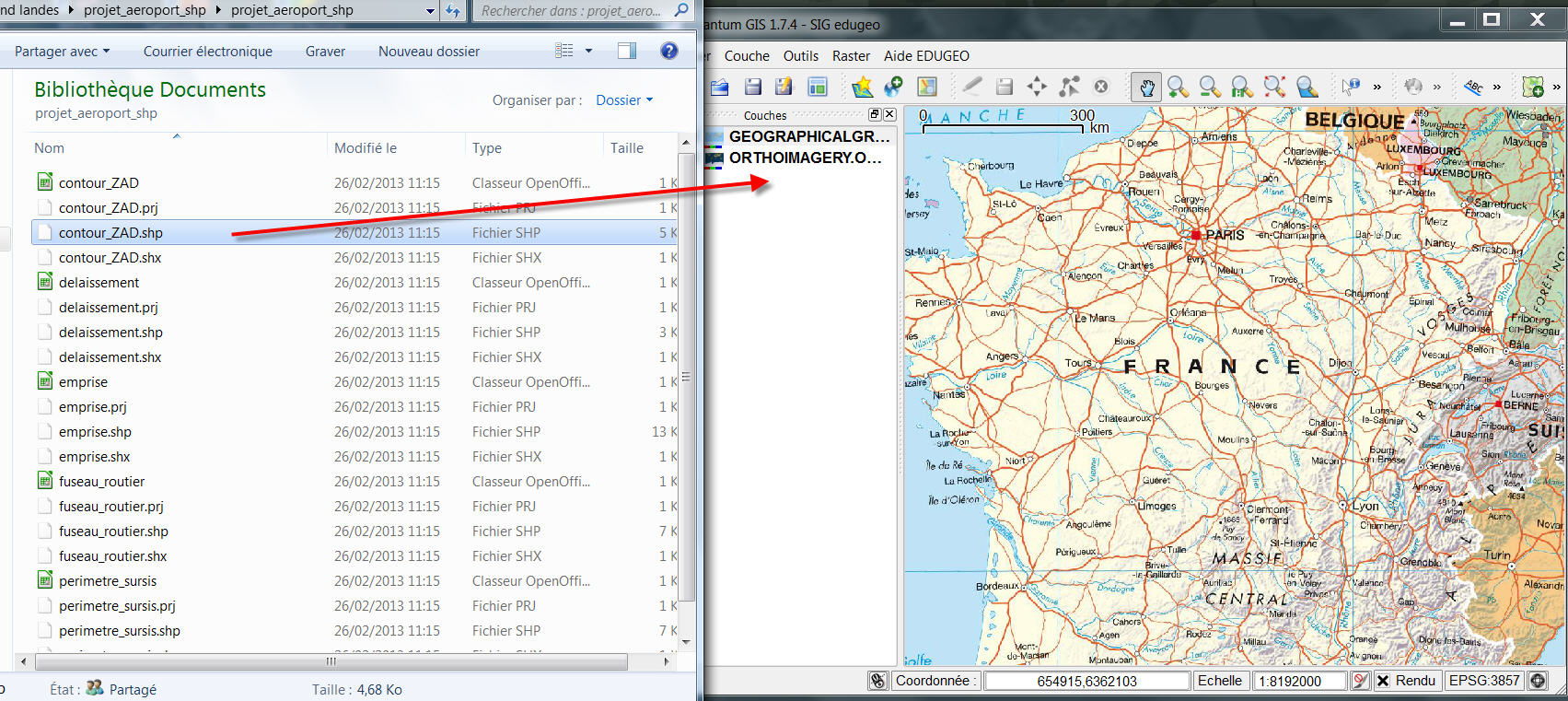 Il reste à ajouter les couches shapefiles : un simple glisser déposer dans le gestionnaire des couches suffit pour visualiser les données.