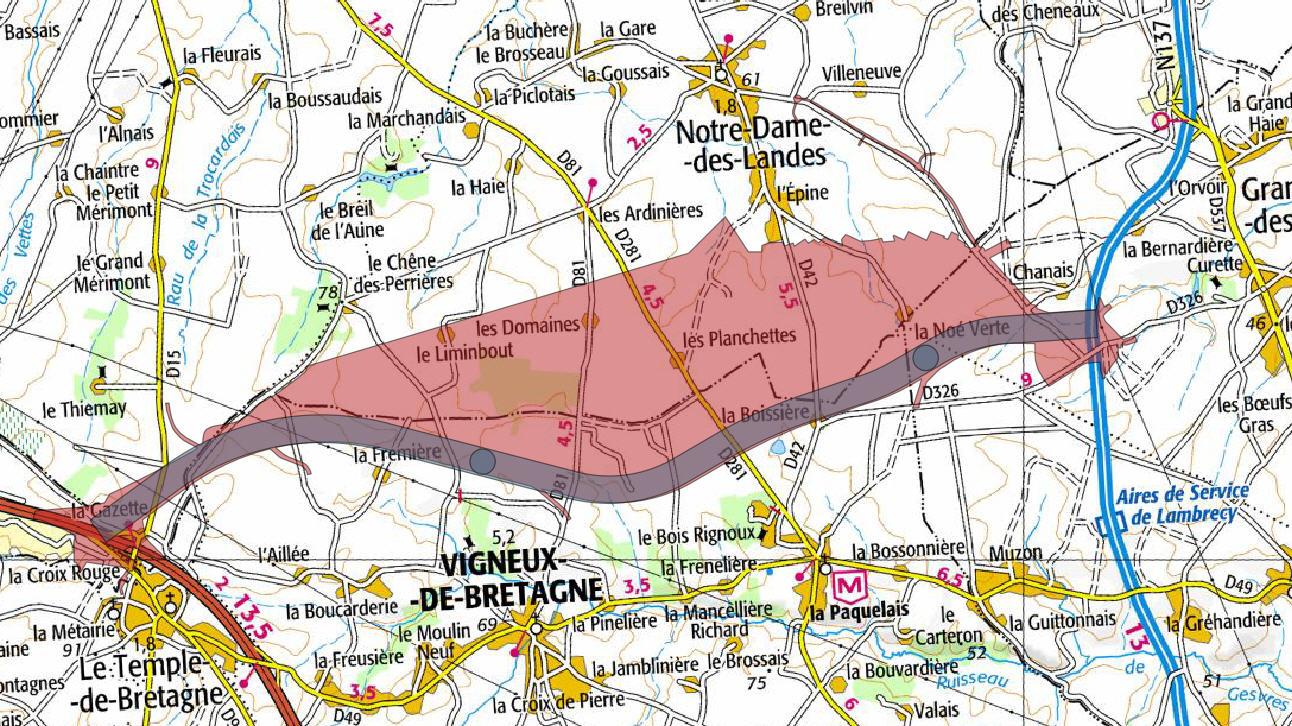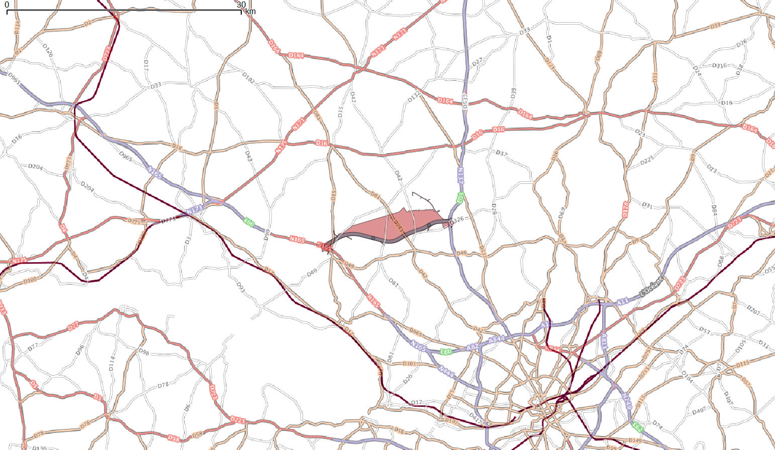 Par exemple, l'inscription de l'aéroport dans les réseaux terrestres actuels : on visualise içi le réseau ferroviaire (en rouge) et les réseaux routiers.