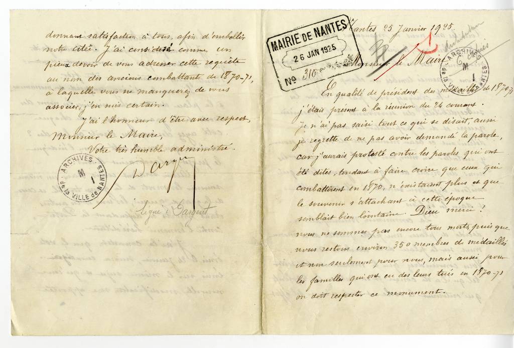 Mais le choix de l'emplacement pose aussi problème... Tour à tour le champ de Mars (doc. 6), la cour du Château, le bas du cours Saint-Pierre sont envisagés. Mais là, nouvel obstacle : il faudrait démonter le monument aux morts de 1870, pour y installer celui consacré à la Grande Guerre, ce qui provoque une levée de boucliers des puissantes associations d'anciens combattants qui n'acceptent pas que l'on touche à un monument sacré (doc. 7).