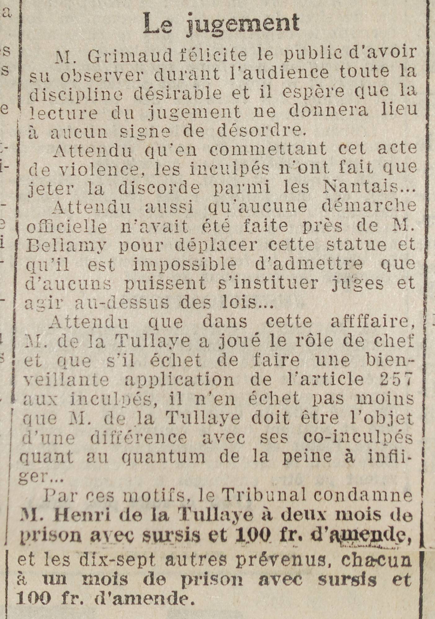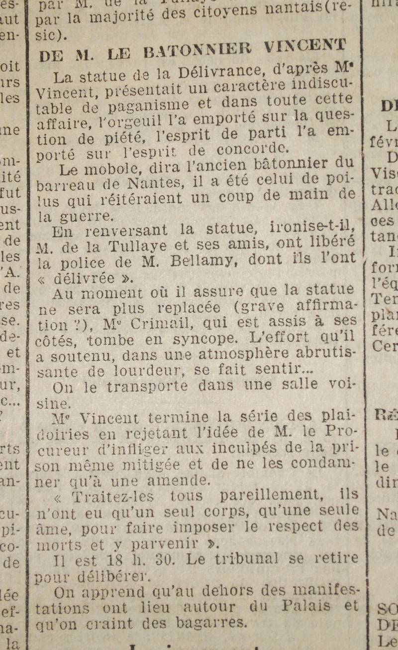 La condamnation de cet acte, le 24 février 1928 (doc. 13), par le tribunal correctionnel de Nantes ne réhabilitera cependant pas la statue dans sa position initiale, et le monument aux morts gardera l'aspect dépouillé du premier projet (doc. 14).