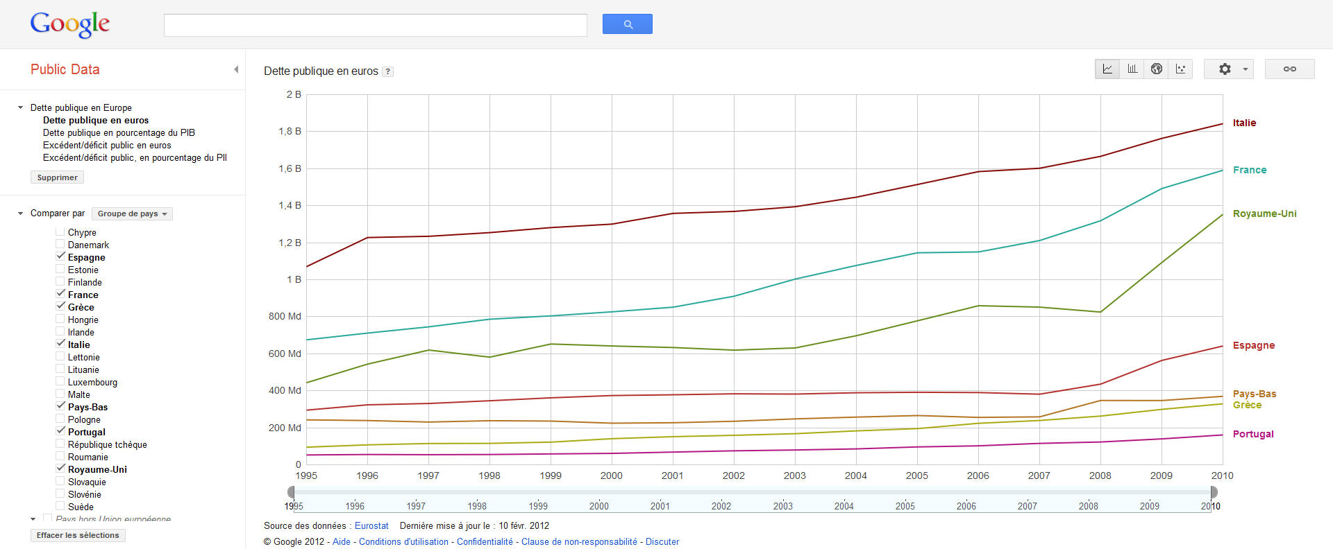 Google propose depuis quelque temps un outil assez utile qui permet d'afficher en quelques clics des graphiques à partir de source de données sérieuses comme par exemple Eurostat. Il s'agit de Public data.