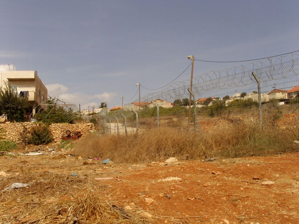 Coexistence de deux quartiers, à gauche la banlieue nord de Hébron, à droite la colonie de Givat Harsina, séparés par un haut grillage, doublé d'un éclairage nocturne permanent et d'une route pour des patrouilles militaires ou réservée aux colons juifs.