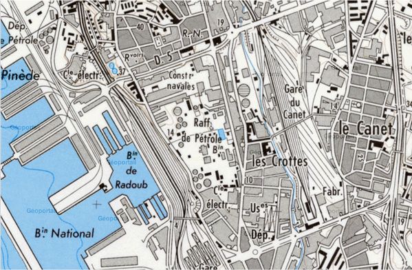 Le quartier les Crottes au début des années 50 : l'emprise des activités industrielles est important : fabrique, usines, raffinerie de pétrole, compagnie électrique, constructions navales... Un quartier de plus traversé par les voies de communication, emprises ferroviaires de la gare du Canet, complétées par la trame autoroutière dans les années soixante. Le défi du réaménagement est désormais bien lancé avec par exemple l'implantation d'un centre commercial sur le site des constructions navales.