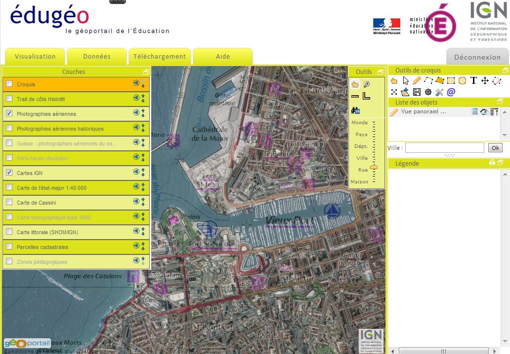 Edugéo permet d'afficher comme dans le géoportail une vue aérienne récente de Marseille, centrée içi sur le vieux port.