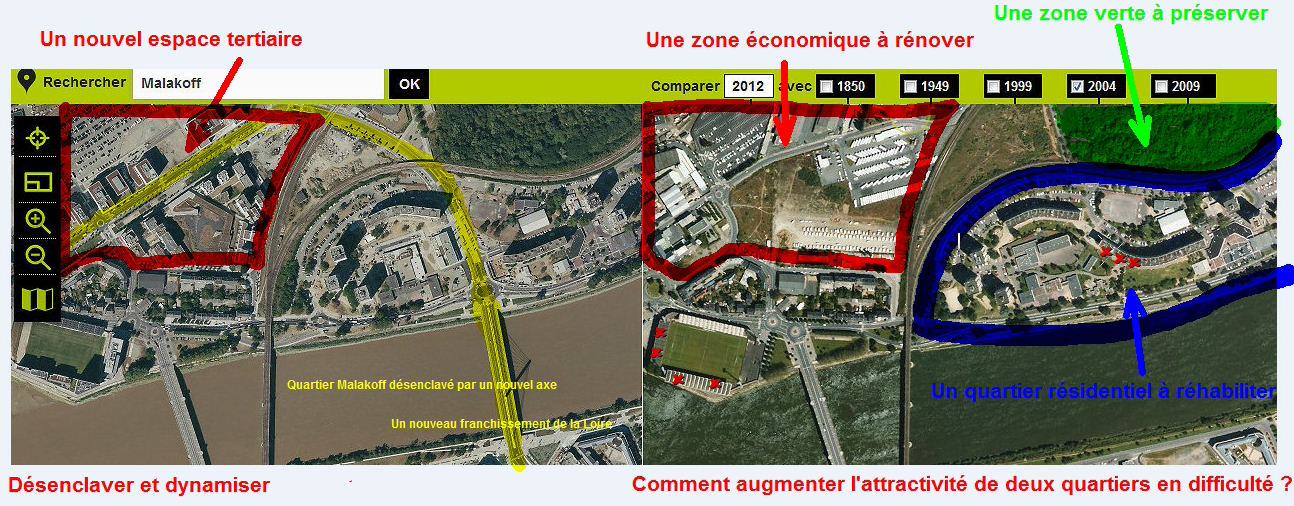 La plus-value consiste surtout dans la possibilité de comparer les données présentées sur un même plan de lecture. Pour cela, l'écran se divise en deux, un cadrage automatique se fait, le curseur se dédoublant afin d'aider au repérage. Une projection en classe est favorisée et de nombreuses démarches sont possibles (voir l'exemple ci-dessous autour du quartier Malakoff à Nantes).