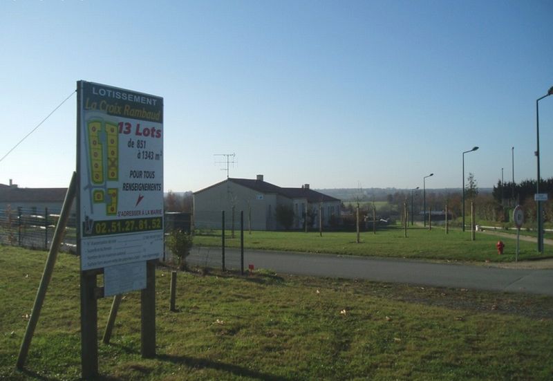 La Rhéorte, les périphéries du bourg grignotées par les lotissements pavillonaires : cette photographie, illustre la rurbanisation des périphéries des bourg ruraux. En arrière-plan, le bourg disparaît au profit des pavillons du second-plan, tandis qu'au premier plan, la pancarte montre l'extension continue du phénomène.
