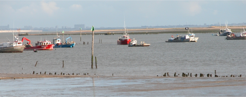 La Baie de l'Aiguillon avec à l'horizon, les silos du port de la Pallice, avant-port de la Rochelle. Au premier-plan, des bateaux pour les ostréiculteurs de la Faute-sur-Mer.