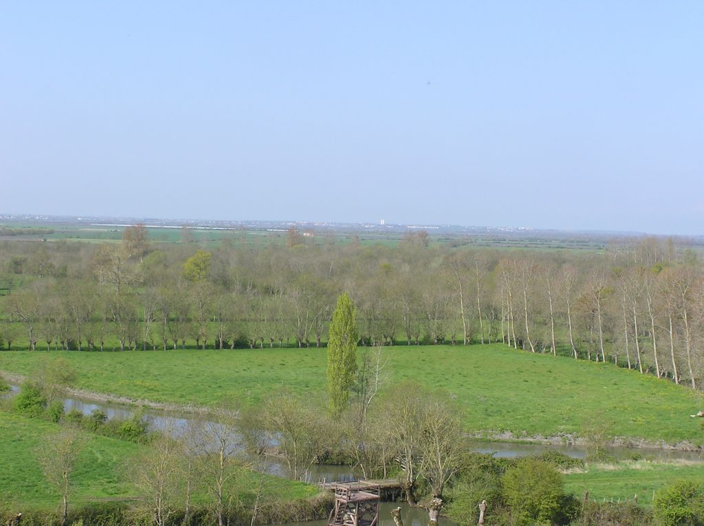 Au pied de l'abbaye de Maillezais, des prairies bordent l'Autise. On aperçoit en arrière-plan, au Nord, la ville de Fontenay-le-Comte.