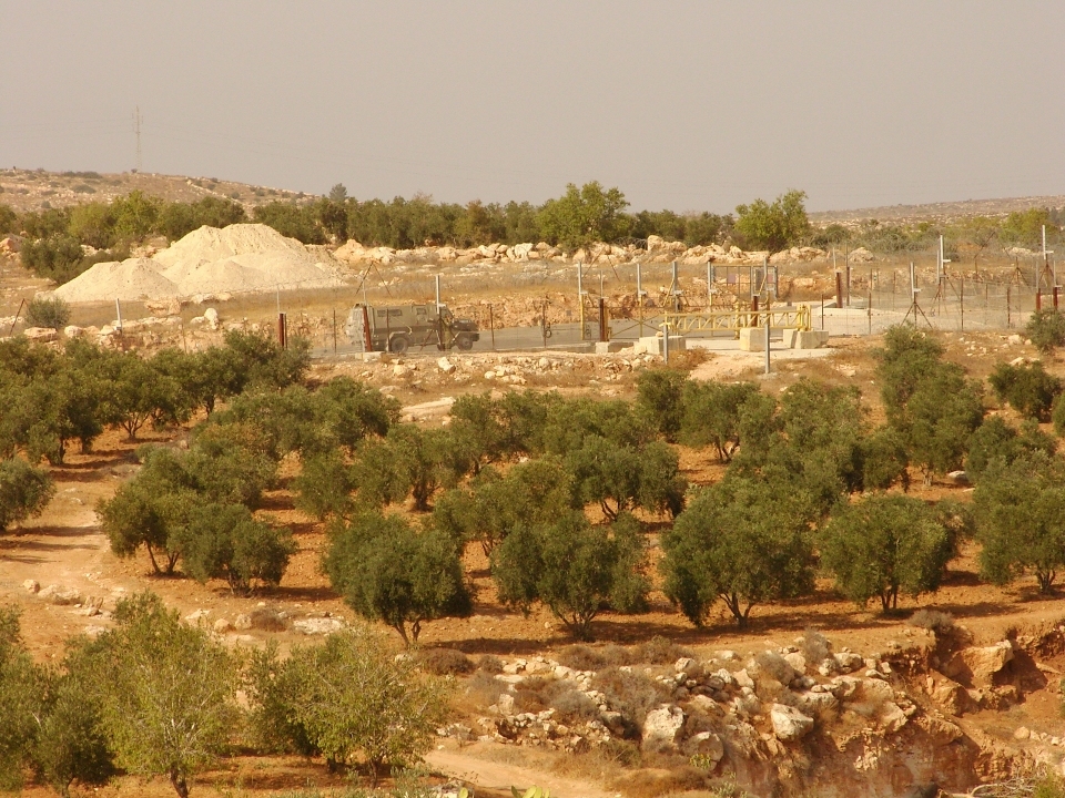 Paysage commun de la Cisjordanie des plateaux, à l'ouest de Hébron : vastes ondulations, oliveraies à perte de vue, s'il n'était l'expression du conflit par la présence de la barrière de barbelés, de la barrière métallique jaune et du véhicule militaire.