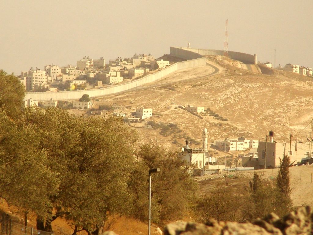 La mosquée au premier plan est un signe de quartiers musulmans de Jérusalem-Est. Le mur haut de plus de 8 m dans les quartiers urbains chevauche les reliefs, fait des incursions parfois très profondes en Cisjordanie, est presque toujours doublé devant de routes réservées aux véhicules militaires.