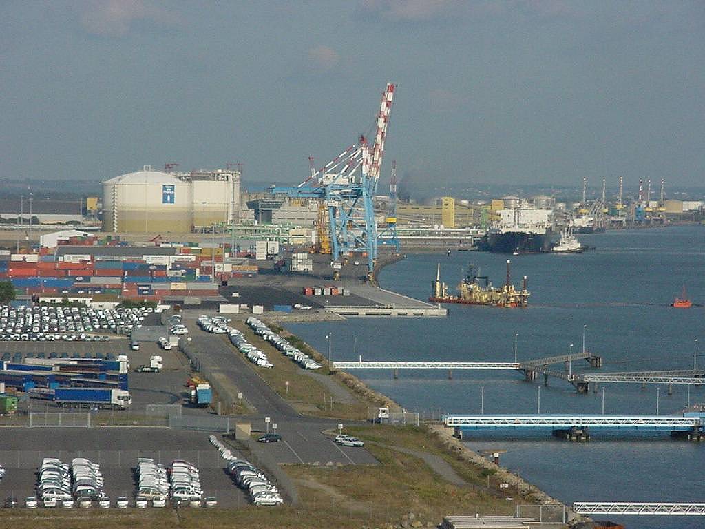 En arrière-plan, les cuves de stockage du méthane pour l'accueil du gaz en provenance d'Algérie et du Nigéria. Le port de Montoir est le plus important d'Europe avec 10 milliards de m3 /an. Montoir reste un port de seconde catégorie en Europe derrière les géants comme Le Havre en France (trafic de 10 fois inférieur en tonnage) et bien sûr Rotterdam.