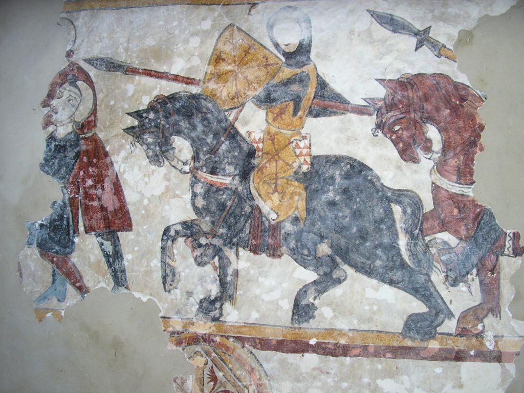 L'ensemble des peintures murales de l'église de Neau retrace la vie de Saint Vigor, elles datent du XIVe siècle. L'exemple présenté ici se trouve sur le mur sud et montre un chevalier poursuivant des paysans.