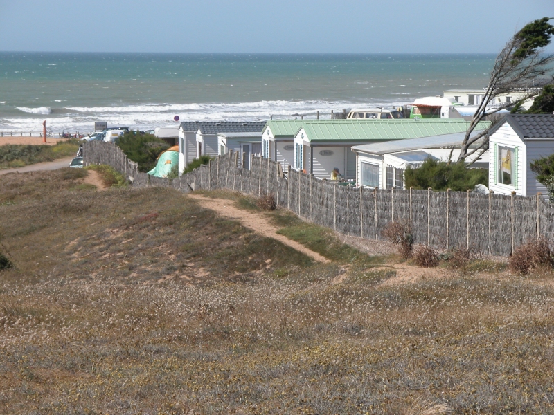 Bord de mer au nord des Sables d'Olonne, dune naturelle piétinée et camping d'avant "la loi littoral" avec ses mobil-homes, forme croissante de ce type de tourisme d'aujourd'hui. Effet du vent en drapeau sur arbuste. Cette côte est exposée.