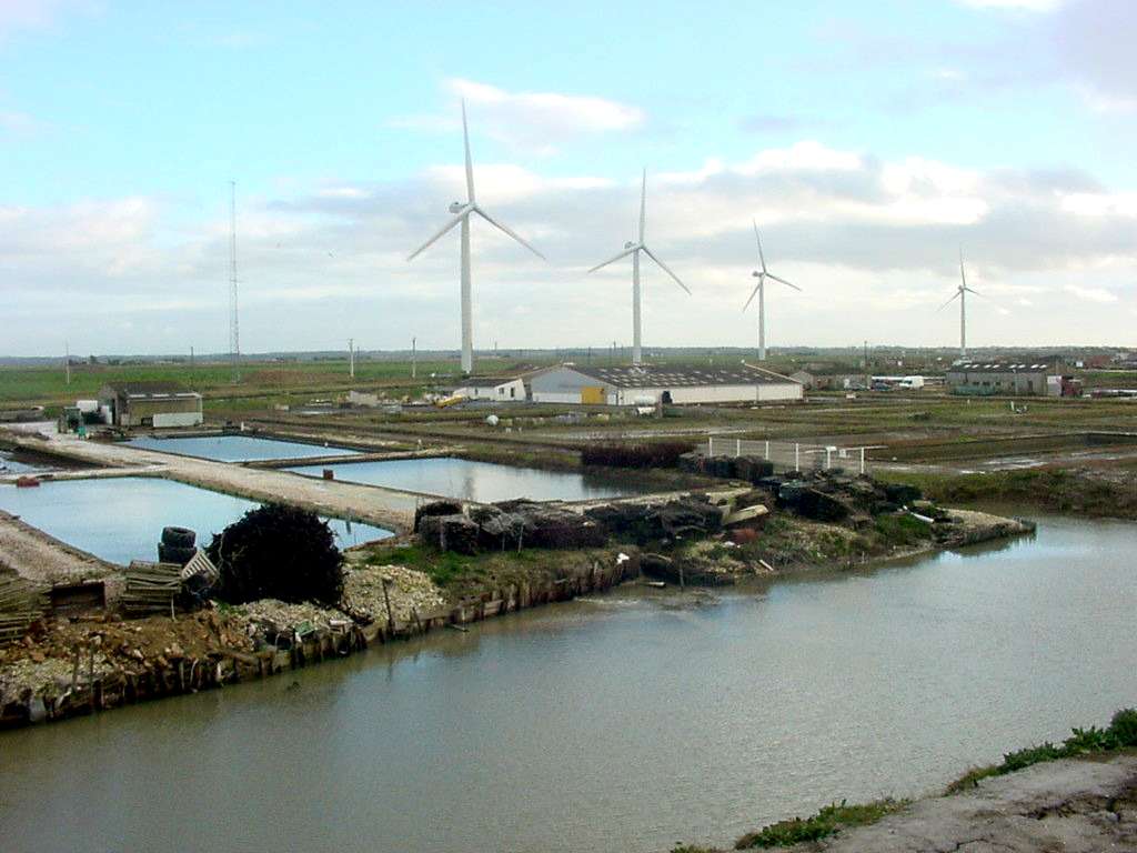 Entre le petit port des Champs et celui du Bec, près de l'Époids, vue sur les extensions des espaces de travail des ostréiculteurs. Vue sur les bassins d'affinage des huîtres (éoliennes de Bouin à l'arrière-plan).
