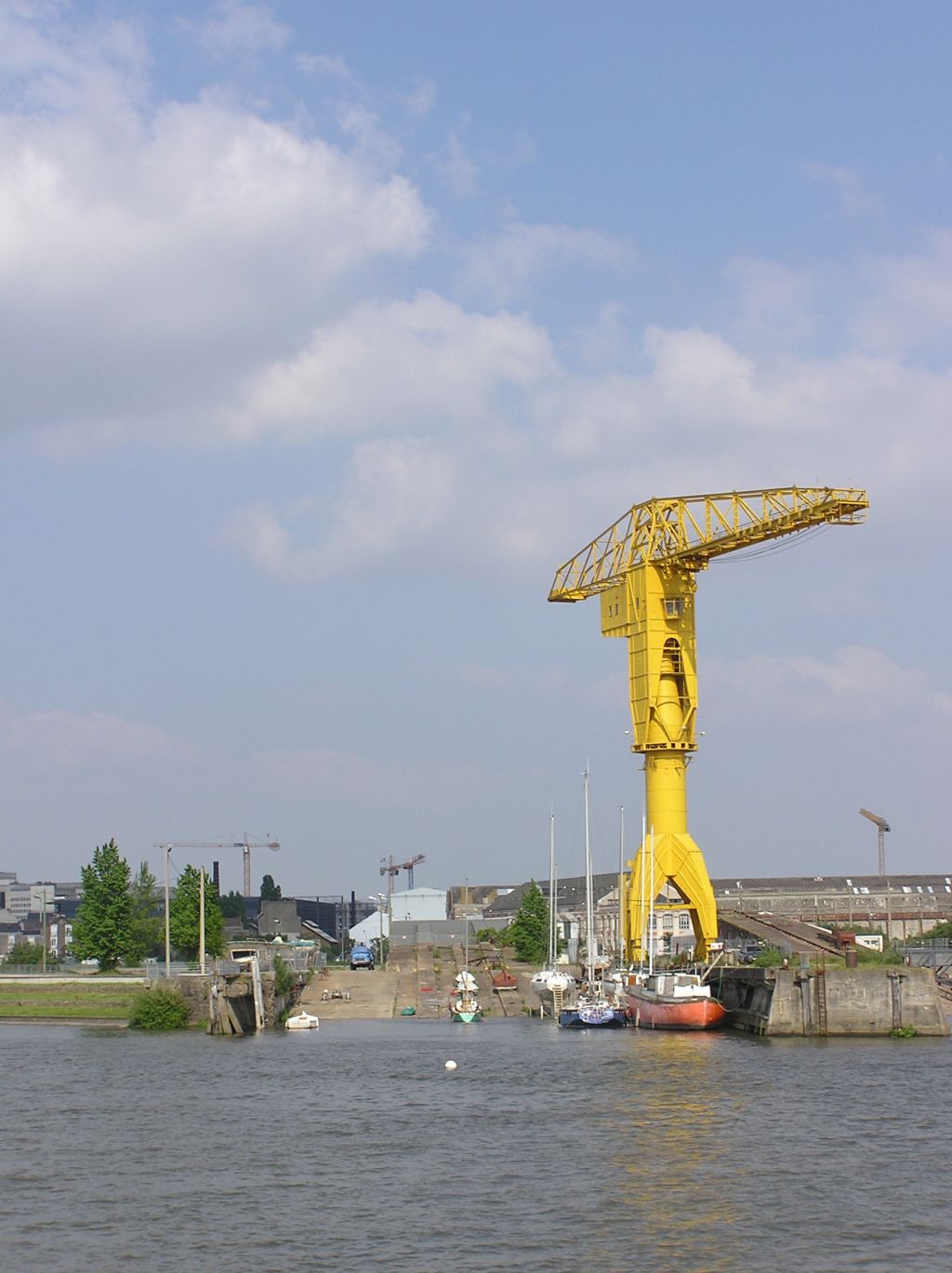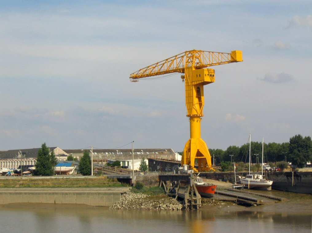 la grue vue de la Loire, à gauche de la grue, les anciennes cales des chantiers navals.