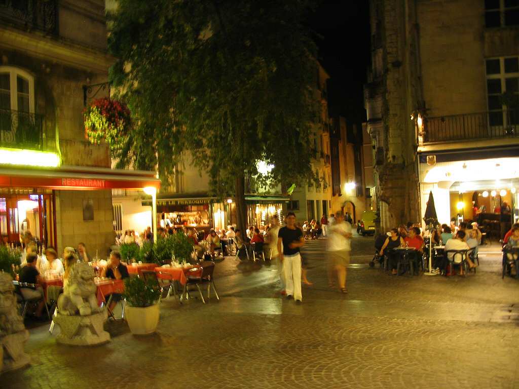 La place du Bouffay le soir : le départ de rues piétonnes où ont fleuri de nombreux restaurants.