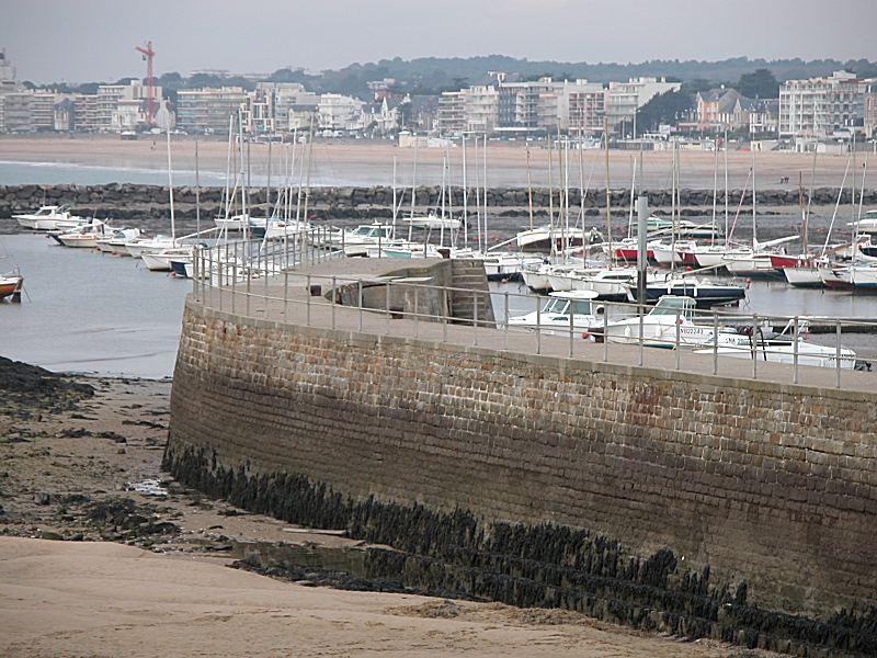 Le cordon dunaire résiduel et l'amorce de la grande plage à marée basse, vue côté Pornichet. S'ancrant sur le cordon de dunes, le vieux quai d'un petit abri pour les pêcheurs du siècle passé, quand coexistaient tourisme et activités plus traditionnelles. À l'arrière-plan, les hautes dunes plantées de pins maritimes et autres conifères qui dominent le mur d'urbanisation du remblai construit sur le cordon de sable désormais masqué.