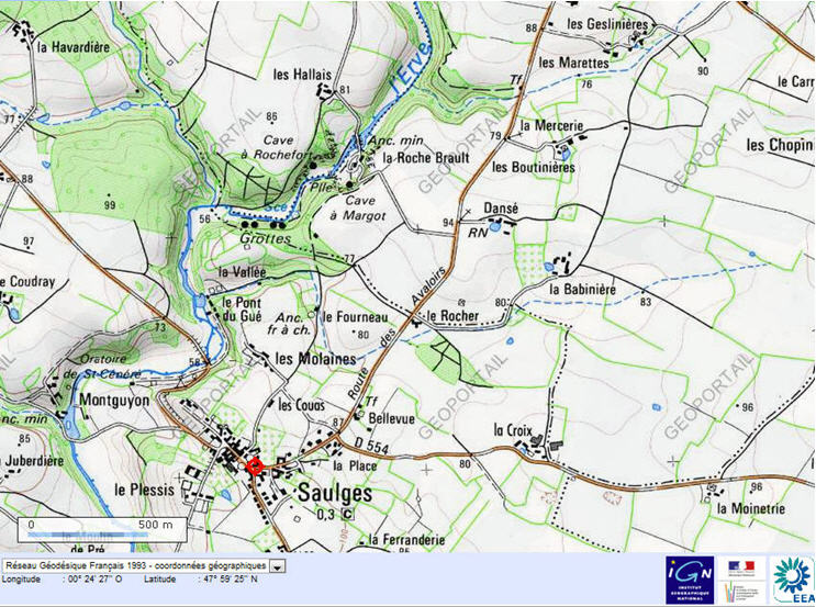 Une requête géographique sur Saulges dans le géoportail permet d'afficher la carte IGN du secteur étudié.
