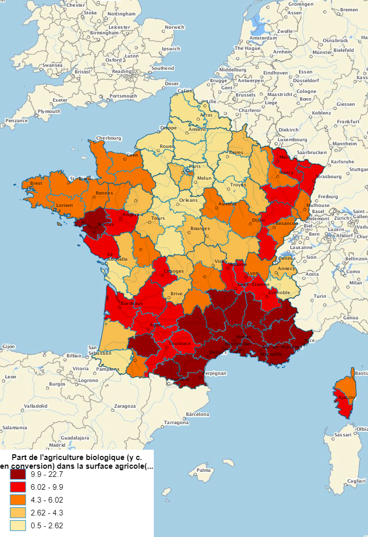 | Surfaces cultivées en agriculture biologique Les superficies totales en agriculture biologique comprennent : - les surfaces « certifiées bio » qui rassemblent les parcelles dont la période de conversion est terminée et dont la production peut être commercialisée avec la mention « agriculture biologique » ; - les superficies en conversion (la durée de conversion variant de 2 ans pour les cultures annuelles à 3 ans pour les cultures pérennes). L'indicateur rapporte la surface en agriculture biologique (y compris les surfaces en conversion) à la surface agricole utilisée des exploitations (SAUE). Sources :Agence bio (agence de promotion et de développement de l’agriculture biologique) ; Service de la Statistique et de la Prospective (SSP) Méthode : quantiles, 5 classes | Les énergies renouvelables sont les énergies dérivées de processus naturels en perpétuel renouvellement, notamment l’énergie générée par le soleil (photovoltaïque ou thermique), le vent (éolienne), l’eau des rivières et des océans (hydraulique, marémotrice…), la biomasse ainsi que la chaleur de la terre (géothermie). Les installations prises en compte ici sont uniquement celles produisant de l’électricité renouvelable et pour lesquelles a été conclu un contrat d'obligation d'achat en vertu de la loi du 10 février 2000 relative à la modernisation et au développement du service public de l'électricité : au total, près de 1300 installations ne sont pas comptabilisées, parmi lesquelles de nombreuses centrales hydrauliques (barrages d’EDF…) et unités d'incinération de déchets ménagers. Sources : SDES d’après EDF, EDF SEI, entreprises locales de distribution Méthode : Méthode : représentation sectorielle, camenberts, couleurs : manuel |