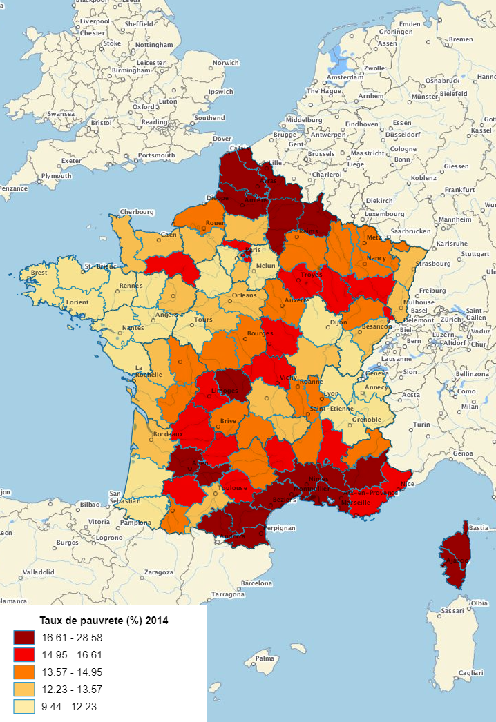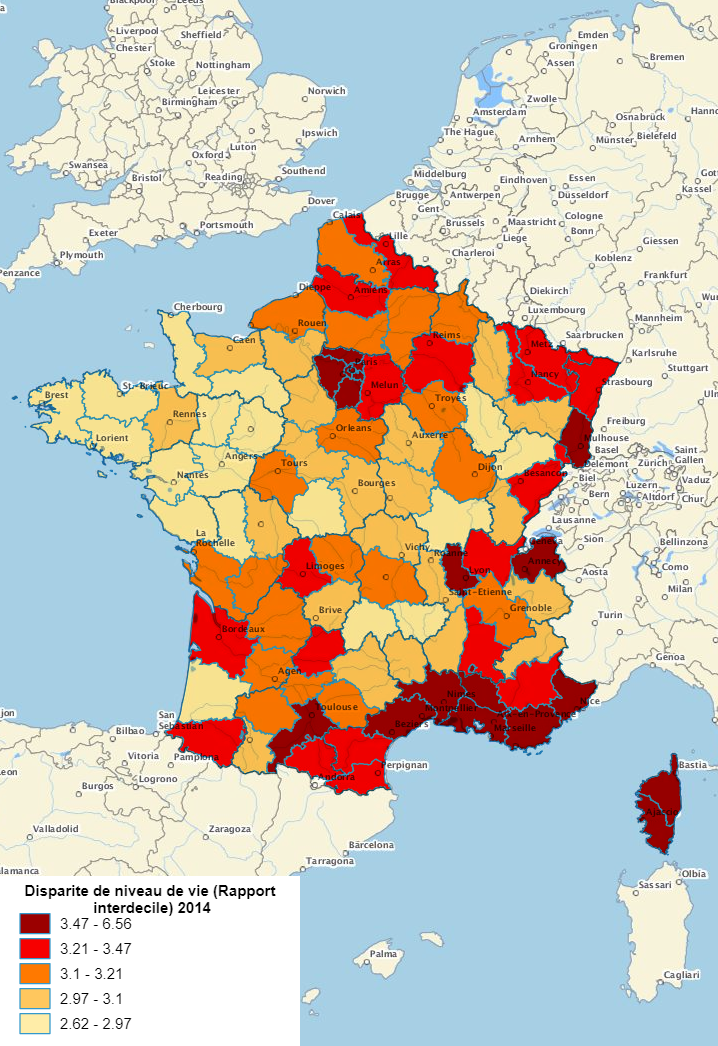 Comparaison des disparités de niveau de vie avec le taux de pauvreté 2014