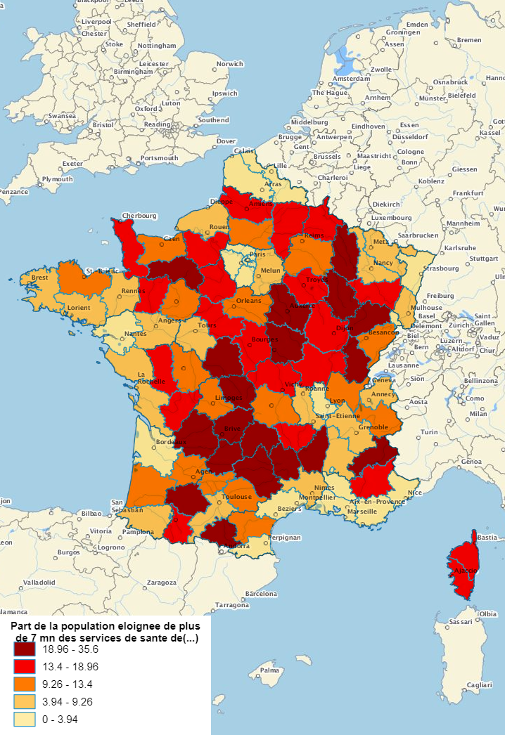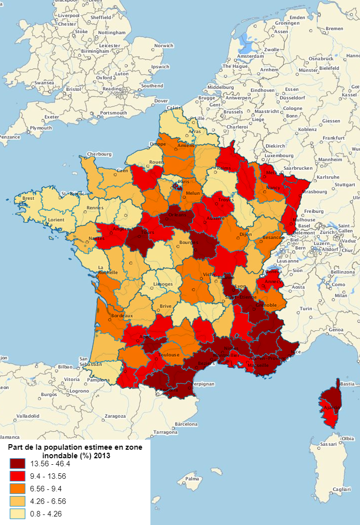 L'accès aux soins de proximité Il s’agit de la moyenne des parts de la population à plus de 7 minutes des équipements de santé de gamme de proximité (cinq services de santé de proximité sont identifiés : médecin omnipraticien, chirurgien dentiste, infirmier, masseur kinésithérapeute et pharmacie). Les durées de trajet sont calculées par la route en heures creuses pour aller à l'équipement le plus proche (trajet aller). Lorsque le temps de trajet n'est pas disponible (cas des îles ne disposant pas de l'équipement), la commune est considérée être à plus de 7 minutes de l'équipement. Sources : Insee, RP2014 BPE2016 ; Nouveau distancier Metric (Mesure des trajets inter-communes / carreaux) à partir des données du RP2011 Les distances infracommunales aux équipements sont prises en compte depuis la BPE 2015 (auparavant, la population habitant une commune équipée était considérée à 0 minute de l’équipement). Méthode : quantiles; 5classes | Population exposée au risque d'inondation Pour déterminer les zones inondables, sont retenues ici les inondations par les fleuves et les cours d'eau. Ne sont pas pris en compte les phénomènes de remontées de nappe et de submersion marine. Pour une zone donnée, on retient l'enveloppe maximale des différents contours connus. A partir de 2008, l'estimation de la population en zone inondable est basée sur le carroyage des données fiscales (200mx200m) produit par l'Insee et les données du recensement de la population. L'inventaire a lieu avec une périodicité irrégulière. Sources : Insee, RP2013 et RP2008 ; SDES Méthode : quantiles; 5 classes |