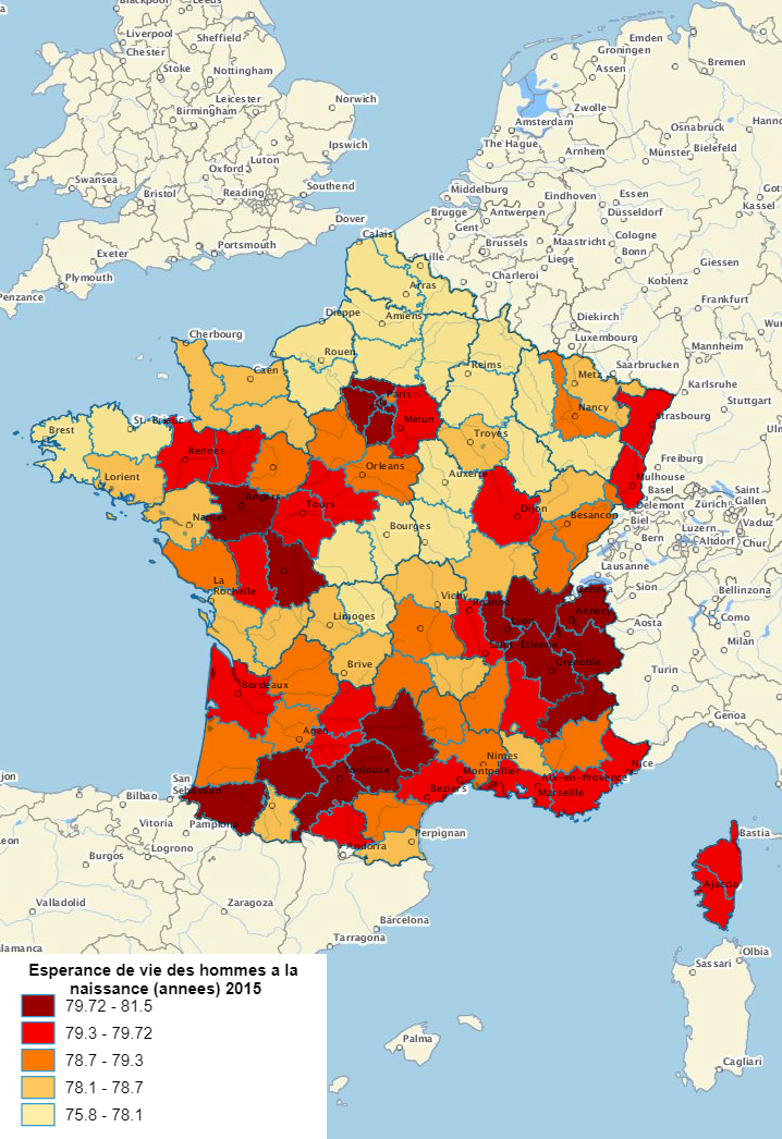 L'espérance de vie des hommes et des femmes à la naissance en 2015.