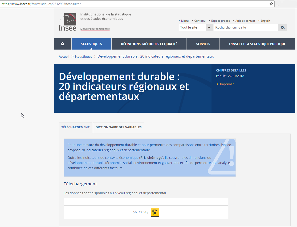 L’Insee propose sur son site 20 indicateurs régionaux et départementaux rassemblés dans un fichier xls disponible en téléchargement.