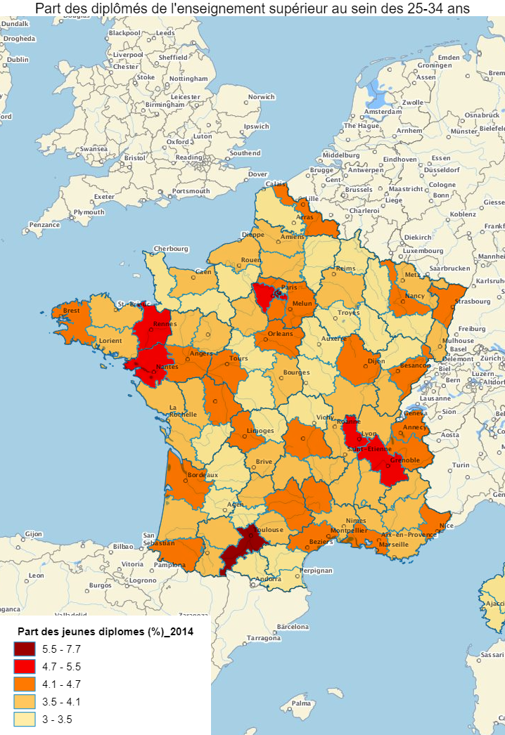 | Méthode : quantiles, 5 classes | Part des diplômés de l'enseignement supérieur au sein de la population des 25-34 ans non inscrite en établissement scolaire Sources : Insee, RP2014 et RP2009 Méthode : quantiles, 5 classes |