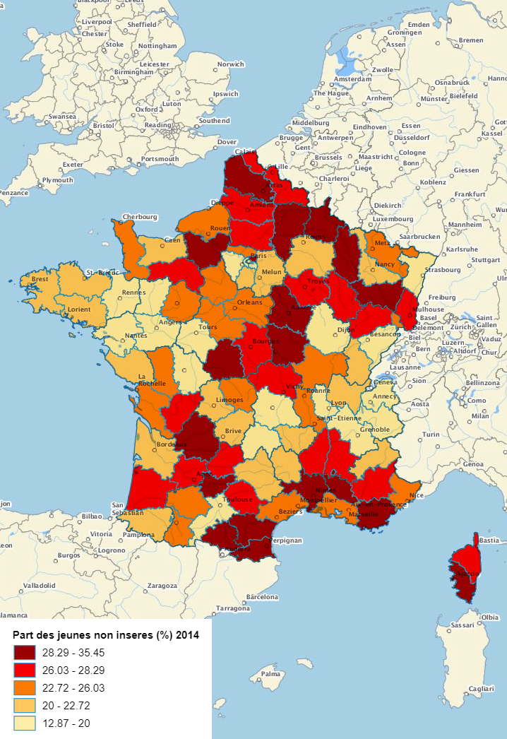 | La part des jeunes non insérés est le rapport des jeunes de 18 à 25 ans qui ne sont pas élèves, étudiants ou stagiaires et n’ont pas d’emploi à l’ensemble de la population âgée de 18 à 25 ans, au lieu de résidence des individus. Sources : Insee, RP2014 et RP2009 Méthode : quantiles; 5 classes |