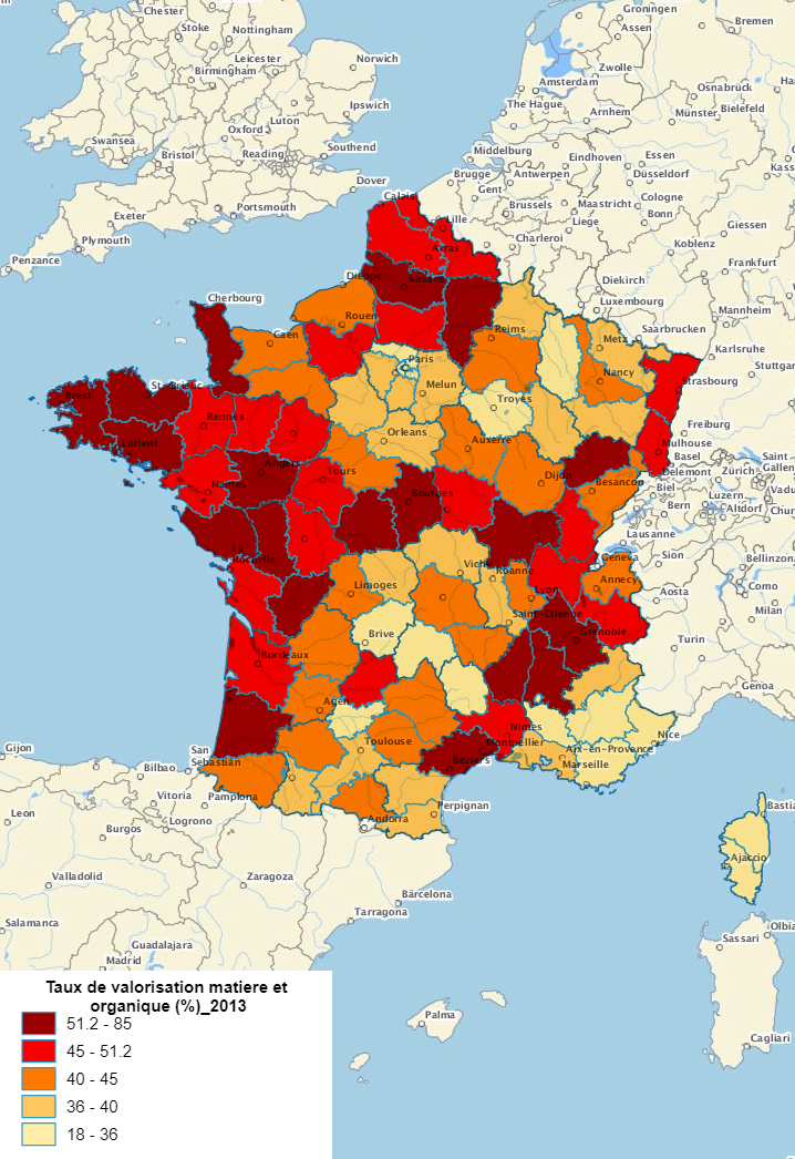 | Valorisation des déchets ménagers Les déchets ménagers comprennent six catégories : les ordures ménagères résiduelles en mélange collectées en porte à porte, le verre et les matériaux secs (emballages, journaux et magazines,...) , collectés en porte à porte ou par apport volontaire aux bornes de collecte, les bio déchets et les déchets verts, les encombrants, les déchets déposés en déchèteries. Le traitement des déchets comprend le recyclage et le réemploi (valorisation matière), ainsi que le compostage, la méthanisation et l'épandage (valorisation organique). Les autres modes de traitement sont l'incinération avec ou sans valorisation énergétique et la mise en décharge. Sources : Ademe Méthode : quantiles, 5 classes | Artificialisation des sols On entend par surface artificialisée toute surface retirée de son état naturel (friche, prairie naturelle, zone humide etc.), forestier ou agricole, qu'elle soit bâtie ou non et qu'elle soit revêtue (exemple : parking) ou non (exemple : jardin de maison pavillonnaire). Les surfaces artificialisées incluent donc également les espaces artificialisés non bâtis (espaces verts urbains, équipements sportifs et de loisirs etc.). Sources : SDES, CORINE Land Cover (CLC) CORINE Land Cover est une base de données d’occupation des sols produite dans le cadre du programme européen d’observation de la Terre Copernicus. Elle est disponible pour 1990, 2000, 2006 et 2012. Méthode : quantiles, 5 classes |
