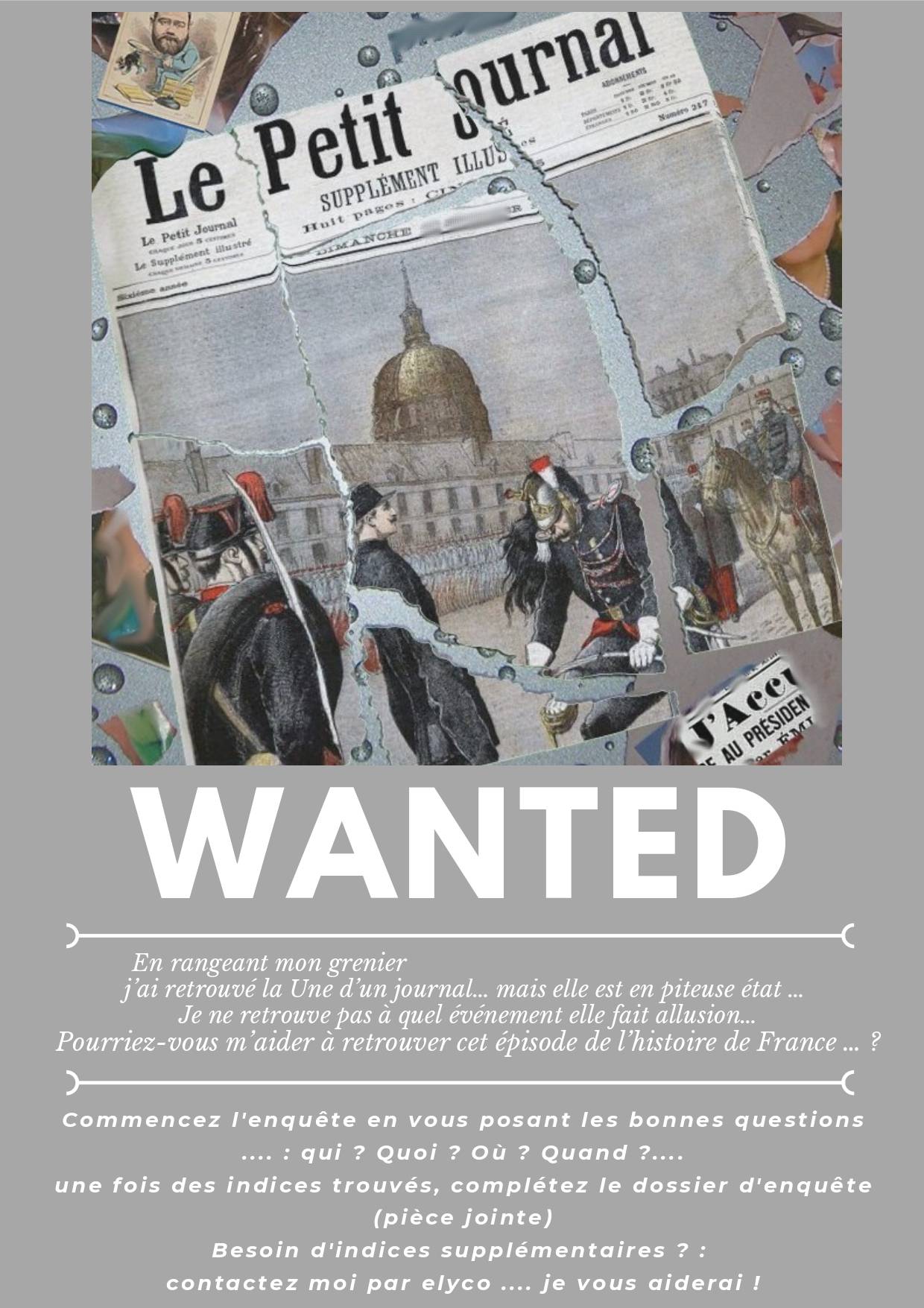 Il est proposé aux élèves, par binôme, durant le confinement, de mener une enquête afin de réosudre une énigme historique. Les élèves disposent de la Une du Petit Journal illustrant la dégradation du capitaine dreyfus le 5 janvier 1895. Ce document est volontairement dégradé afin de scénariser l'enquête....