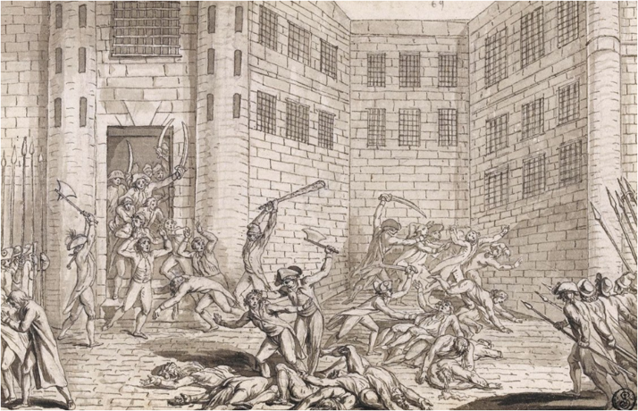 Les massacres de septembre, où dans un climat de psychose collective, la population assiègent les prisons et exécutent des aristocrates et des prêtres réfractaires, peuvent être évoqués à partir de gravures anonymes.
