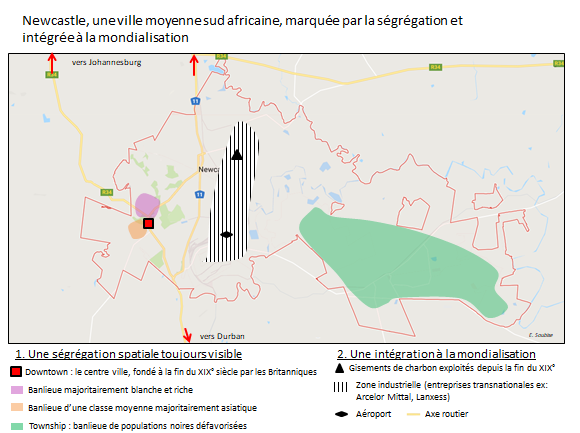 Dans un premier temps, une étude de cas concernant une ville moyenne sud-africaine est proposée. L’étude est menée à partir d’un SIG et de deux cartes concernant la répartition de la population (par origine et par revenu cf. https://dotmap.adrianfrith.com/ - annexe 1). A partir de ces différents documents, les élèves doit compléter un fond de carte afin de montrer l’héritage post-apartheid et les facteurs d’intégration à la mondialisation.