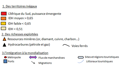 Le troisième temps de la séquence est consacré à la construction de la carte de synthèse. A partir des données de la Banque mondiale, on peut distinguer les différents pays de cet ensemble selon leur IDH et PIB. On peut ensuite demander aux élèves de compléter la carte à partir d’un dossier documentaire (annexe 4). Les élèves doivent alors sélectionner les informations pertinentes, attribuer des figurés à chaque information, réfléchir au classement de ces informations. On peut différencier le travail en distribuant une légende partiellement complétée par exemple.
