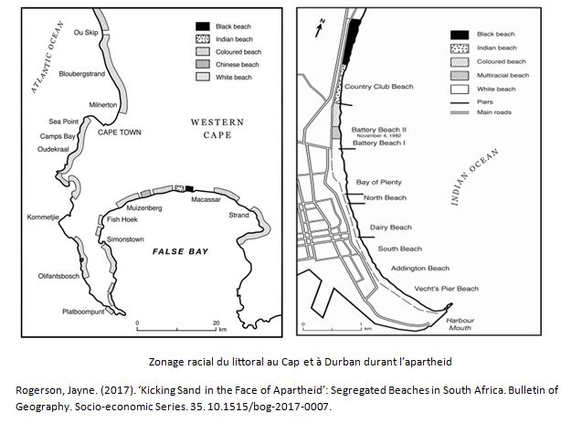 L’objectif est de réfléchir au statut de la plage. Ici c’est un espace réservé où la coprésence est interdite. A l’aide de cartes, on peut montrer que la ségrégation des plages était la norme durant l’apartheid :