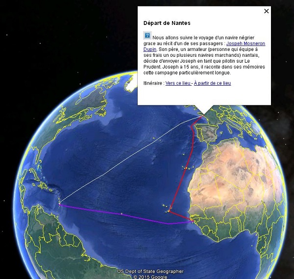 Cette activité est construite à partir d'un fichier kmz (GoogleEarth) retraçant le parcours du navire. Les élèves découvrent les étapes du voyage et doivent ensuite construire un récit d'une traite atlantique.